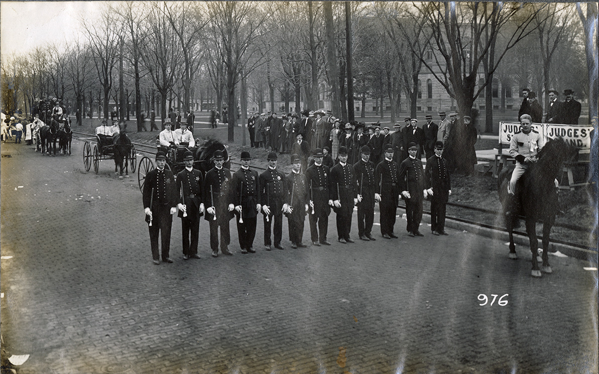 View of students, costumed as police officers, in a parade for the University of Michigan Triennial County Fair in Ann Arbor, Michigan. Man on horseback on right. Horse-drawn carriages, judges' stand and spectators in background. These fairs were held every three years by the Michigan Union, a male-only organization, although fifty different student organizations participated. Funds raised were intended to construct a clubhouse for the Union.