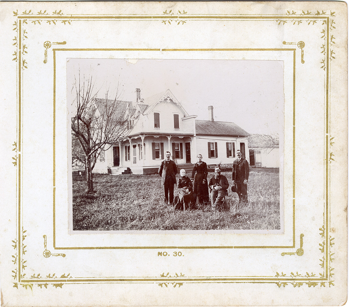 View of members of the Homer Larkin family posing in front of wooden-frame farmhouse in Montrose, Michigan. Printed on front: "No. 30." Label on back: "H. Larkin. This illustration shows the residence of Homer Larkin on his 80 acre farm on section 30 of this township. Mr. Larkin was born in Erie County, New York, September 8th, 1833. July 15th, 1855, he was united in marriage to Minerva Tozer at Busti, New York. She was born at Busti, Chautaugua County, New York, April 11th, 1830. Mr. and Mrs. Larkin are parents of three children, born as follows; Warren E., born at Busti, New York, November 13th, 1856; Carrie G., born in Jackson County, Michigan, November 8th, 1859; Fayette D., born in Montrose township, Genesee County, Michigan, March 9th, 1862. Mr. and Mrs. Larkin are pioneers of the township having come here in 1857. They have aided largely in clearing away the forests and have taken an active part in the development of this part of the township. They are among the most highly esteemed citizens of the township."