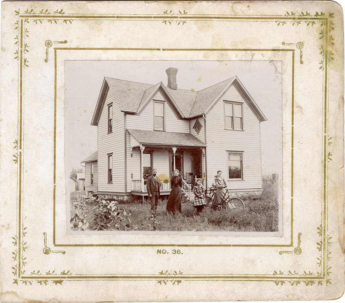 View of members of the Daniel Rose family posing in front of wooden-frame farmhouse in Montrose, Michigan. Girl poses with bicycle on right. Printed on front: "No. 36." Label on back: "Daniel Rose. This illustration shows the residence of Daniel Rose on his 48 acre farm on section 5 of Montrose township. Mr. Rose was born in Royal Oak, Oakland County, Michigan, September 4th, 1862. His father, R.K. Rose, was born in Allighaney [sic] County, New York, January 16th, 1832. His mother's maiden name was Jane Pridgeon and she was born in Lincolnshire, England, September 12, 1837. When Daniel was six years of age his parents moved to Vienna township, Genesee County, Mich., where they still reside and where he was reared. February 22nd, 1886, he was united in marriage to Anna Mundy. She was born in Clayton township, Genesee County, Michigan, April 2nd, 1869. Her father, Thomas Mundy, was born in England, November 16th, 1838. Her mother, whose maiden name was Mary Jane Darling, was born in Lockport, New York, in 1842. Mr. Mundy still resides in Clayton township but Mrs. Mundy's death occured [sic] Nevember [sic] 2nd, 1889. Mr. and Mrs. Rose are parents of three children, two of whom are living, they are Viola Irma, born in Clayton township, Genesee County, Michigan, November 19th, 1886; Ethel Mae, born in Clayton township, April 12th, 1889 and Lottie Jane, born in Vienna township, Genesee County, Michigan, December 30th, 1892. Ethel Mae died June 2nd, 1893. Mr. Rose is a very successful contractor and builder and enjoys a profitable business. He and his family enjoy the esteem of all who know them."