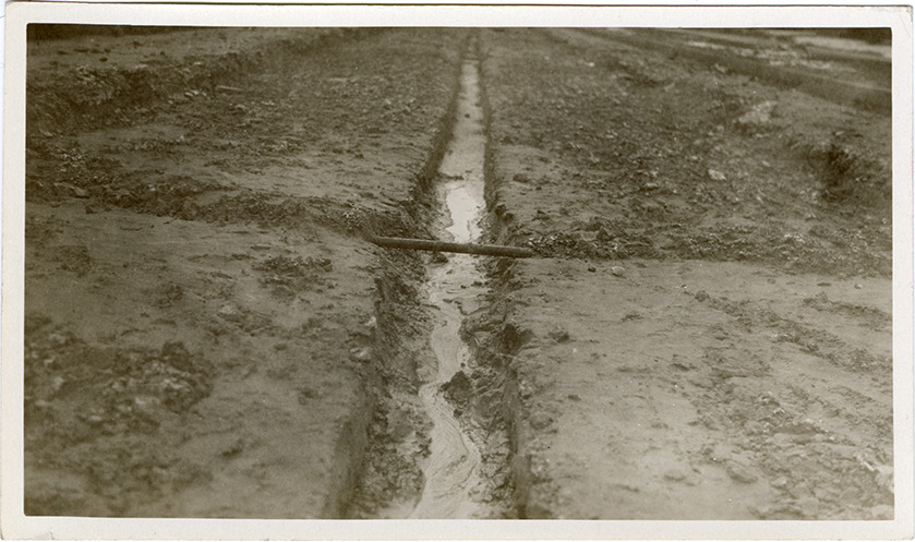 View of a gas line on Van Dyke, during the construction of the Detroit Street Railway. Typed on back: "#41. 3-9-21. Time 10:40 AM. Weather very dull. Looking southeast. Location: In front of house 3437, center of Van Dyke. Subject: New gas line to replace one torn up by steam shovel."