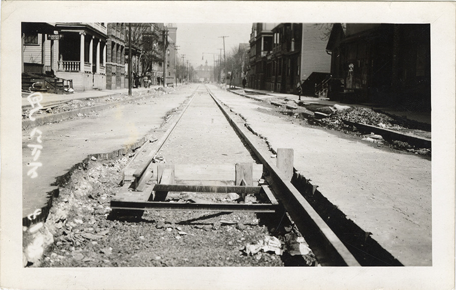 View of street-railroad tracks on Eliot, looking from Hastings, during the construction of the Detroit Street Railway. Houses in background. Typed on back: "#296. 4-11-21. Time 2:03. Weather fair. Looking northeast. Location: Center of Eliot. 15' e. of E. Hastings. Subject: Looking northeast down Eliot from Hastings."