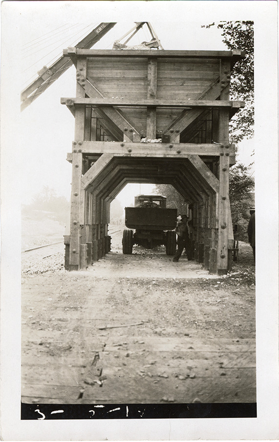 View of a truck under new stone bin at Candler Yards, during the construction of the Detroit Street Railway. Typed on back: "#595. 3-14-21. Time 10:21. Weather fair. Location: Candler Yards. Subject: New bins complete Candler Yards."