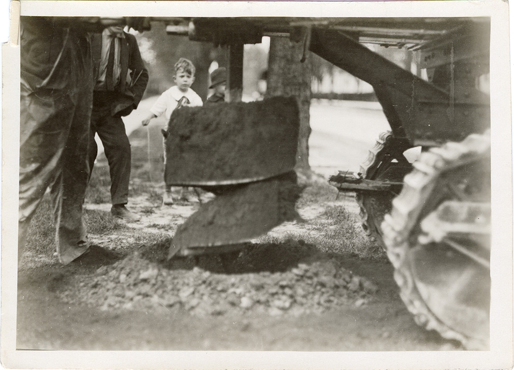Close-up view of a post hole boring machine with auger on Van Dyke, north of Willard, during the construction of the Detroit Street Railway. Two boys and a man in background. Typed on back: "#427. Date 5/4/21. Time: 2:32. Weather fair. Location: Van Dyke n. of Williard [sic]. Subject: Post hole machine on Van Dyke in front of house #4839."