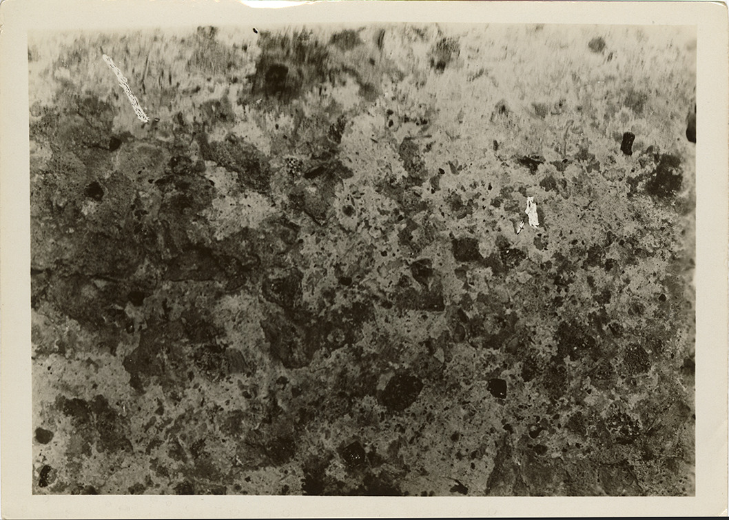 Close-up view of a section of concrete taken from Van Dyke and Willard, during the construction of the Detroit Street Railway. Typed on back: "#603. 6-17-21. 10:55 AM. Weather fair. Location: Lieb [sic, should be Leib] Street yard. Subject: Top view of concrete section of block taken from center of street Van Dyke & Willard." Handwritten on back: "Top of concrete base."