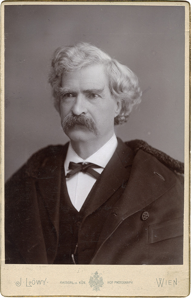Portrait of Mark Twain. Printed on front: "J. Lowy, Kaiserl u. Kon, Hof Photograph, Wien." Printed on back: "J. Lowy, K. u K., Hof Photograph, Wien, Weihburggasse no. 31. K.K. Cartenbaugesellschaft, 1896. Telephon no. 2278, Vervielfaltigung Vorbehalten." Handwritten on back: "Mark Twain, Samuel Clemens."