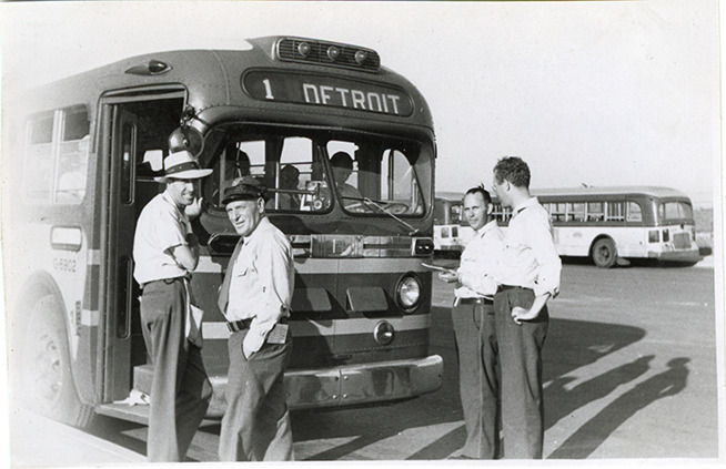 View of Jeff Robbins, dispatcher, and bus drivers Red, Jack Onstott and Tom Skinner in front of a Greyhound bus at Michigan Racing Association racetrack in Livonia, Michigan. Handwritten on page: "Greyhound loading at M.R.A., July 1952. Jeff Robbins, Red, Jack Onstott, Tom Skinner, drivers." Handwritten on back: "July, 1952. Detroit race track. Jeff Robbins, starter. Red. Mr. Onstatt. Tom Skinner, driver."