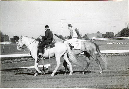 View of jockey Howard riding horse no. 7 at the Hazel Park Raceway. Racetrack employee Craig rides horse on left. Handwritten on page: "At Hazel Park track, August, 1952. #7 jockey is Howard; a grey beauty. Craig." Handwritten on back: "HP, Aug. 1952 after 5 pm with tel. lens."
