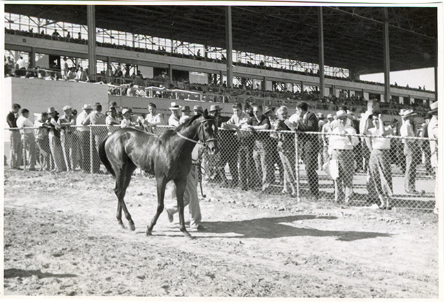 View of a groom leading a horse from paddock on way to track at the Michigan Racing Association racetrack in Livonia, Michigan. Spectators stand along fence; grandstand in background. Handwritten on page: "On way to track from paddock, M.R.A. July, 1952." Handwritten on back: "June 11th, 1952, Wed. at Detroit Race Course, going out to the track."