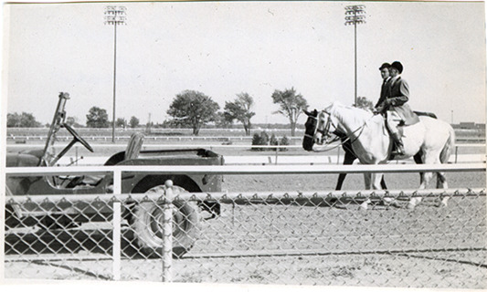 Two stewards riding horses, Michigan Racing Association racetrack