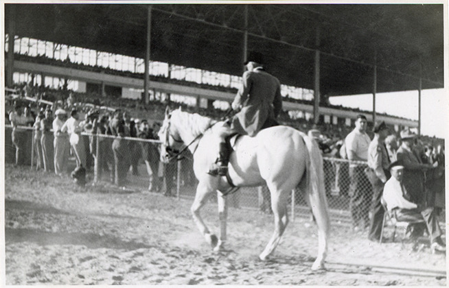 View of a steward riding a horse at the Michigan Racing Association racetrack in Livonia, Michigan. Grandstand and spectators in background. Handwritten on page: "A steward at M.R.A., June, 1952."