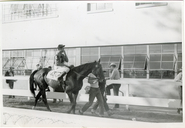 View of jockey, possibly Gordon McCrosky, riding horse no. 4, led by a groom, near the stable at the Michigan Racing Association racetrack in Livonia, Michigan. Onlookers behind fence in background. Handwritten on page: "Near paddock at M.R.A., June, 1952. Gordon McClosky [sic]?"