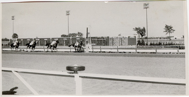 View of horse race at the Michigan Racing Association racetrack in Livonia, Michigan. Scoreboard in background. Handwritten on page: "At M.R.A. track, June, 1952. The winner!" Handwritten on back: "Showing the winner, 6-11-52, Wed., MRA."