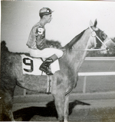 View of jockey posing on horse no. 9 at the Hazel Park Raceway. Handwritten on page: "A grey beauty." Handwritten on back: "With telephoto lens, HP track, Aug. 1952 after 5 pm."