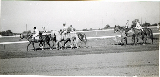 Jockeys walking horses on track, Hazel Park Raceway
