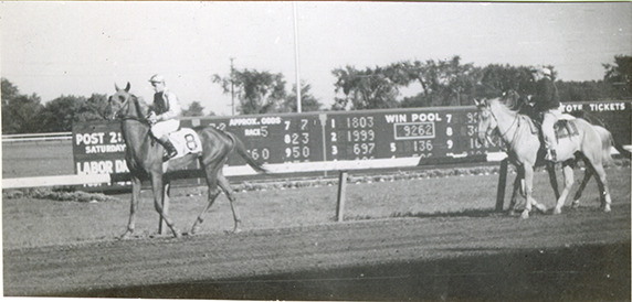 Jockeys walking horses on track, Hazel Park Raceway