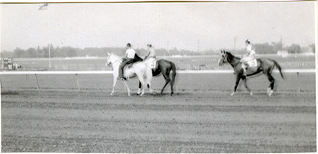 View of jockeys walking three horses on track at the Hazel Park Raceway. Handwritten on page: "At Hazel Park track, August, 1952."