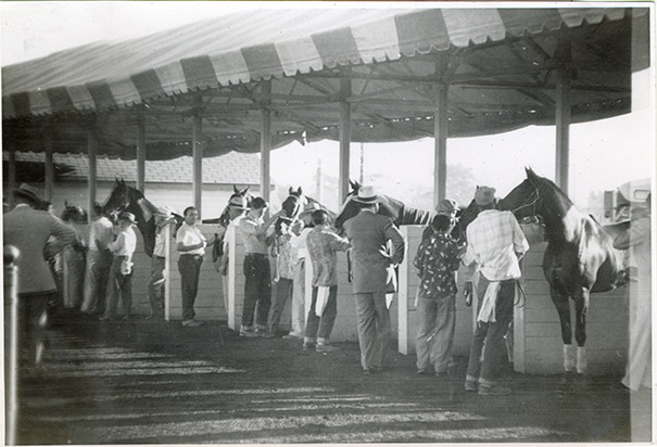 View of grooms with horses in paddock at the Hazel Park Raceway. Horses in stalls, with striped canopy overhead. Handwritten on page: "At Hazel Park, August, 1952. In the paddock at Hazel Park track, with telephoto lens."