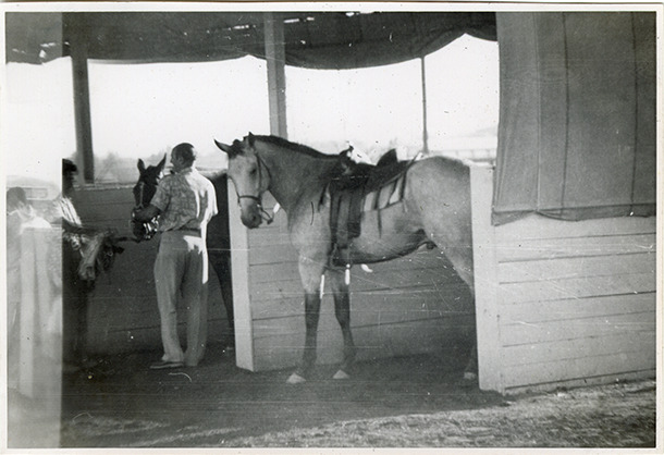 View of grooms with two horses in paddock at the Hazel Park Raceway. Horses in stalls, with canopy overhead. Handwritten on page: "At Hazel Park, August, 1952. In the paddock at Hazel Park track, with telephoto lens."