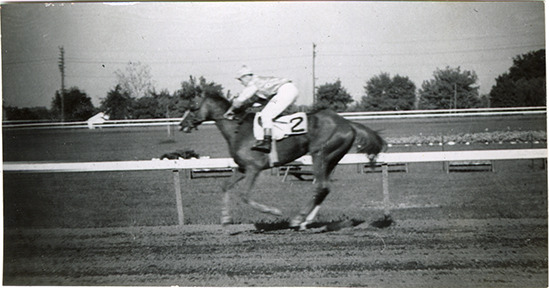 Jockey Richard Lawless riding horse "Corky Paul," Hazel Park Raceway