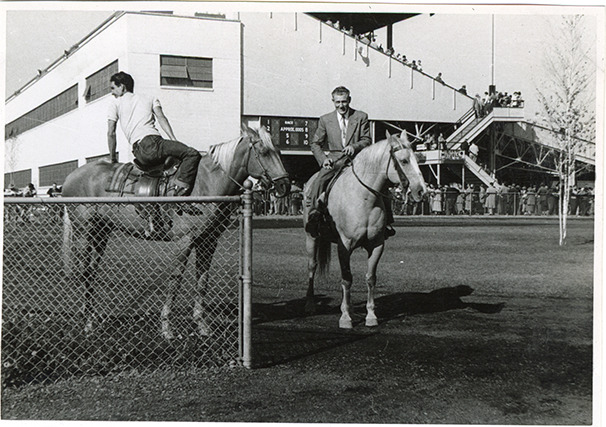 Two riders posing on lead horses, Hazel Park Raceway