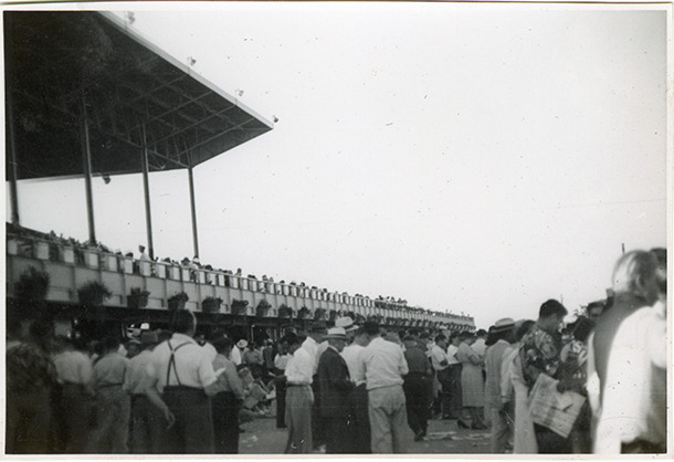 Part of an album of photographs taken by Cathie Monticelli. Inscribed inside front cover: "My book, at the race track, 1952 by Cathie Monticelli, 1426 Pearson Ave., Ferndale 20, Michigan."