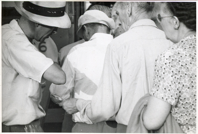 Close-up view of Jeff Robbins, dispatcher, watching passengers boarding a Greyhound bus at the Hazel Park Raceway. Handwritten on page: "Close-up with telephoto lens, Aug. 1952." Handwritten on back: "H.P. Aug. '52, tel. lens, after 6 pm."