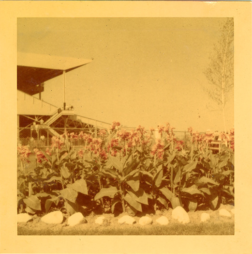 Canna lilies in front of grandstand, Hazel Park Raceway
