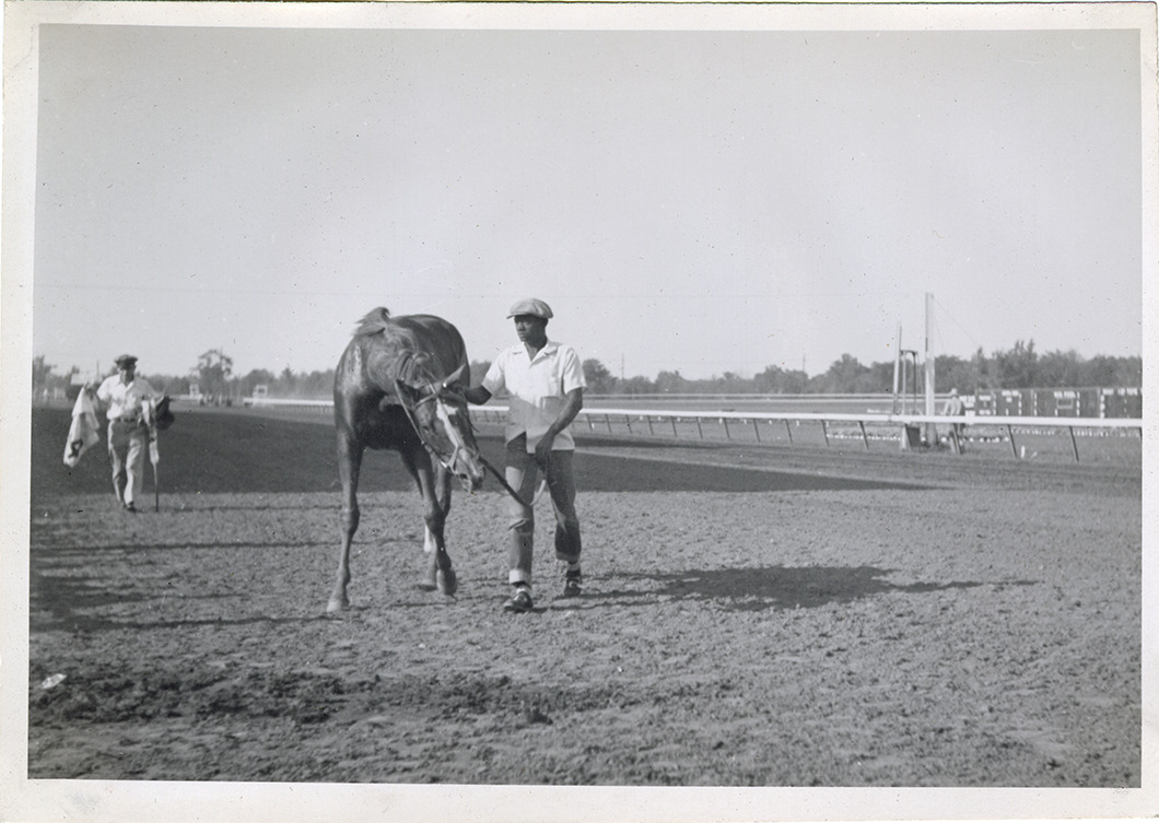 View of a groom leading a horse on track at the Michigan Racing Association racetrack in Livonia, Michigan. Handwritten on page: "June 1952 at M.R.A. track. After the race was won and his saddle removed. The winner."