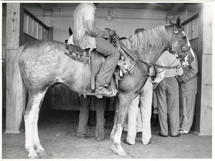 Groom on horse in stable, Michigan Racing Association racetrack