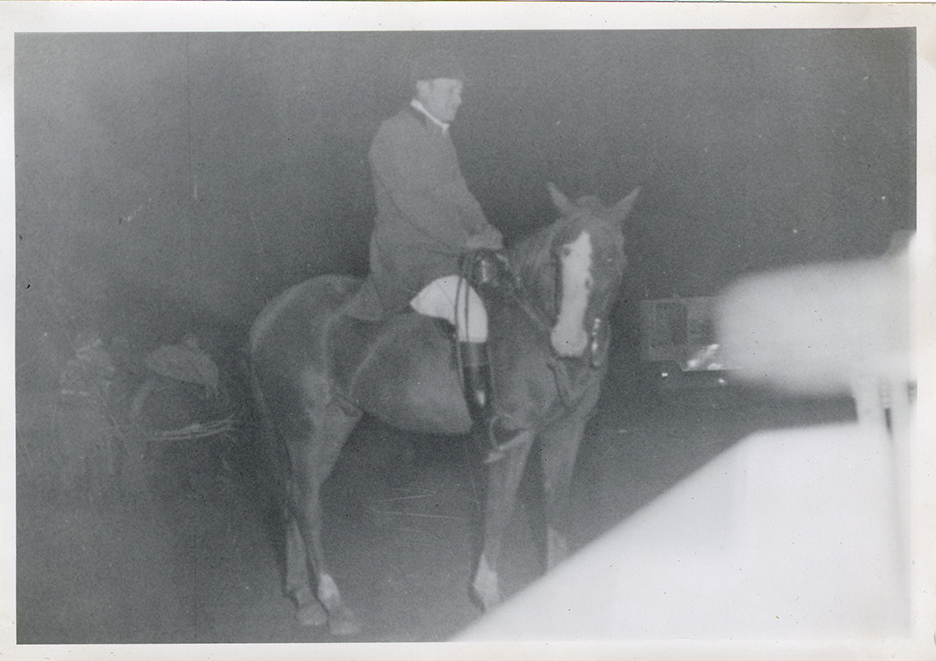 View of steward James E. Stolte posing on horse "Riffles" at the Michigan Racing Association racetrack in Livonia, Michigan. Handwritten on page: "Friday nite, October 10th, 1952 at M.R.A. Detroit race track. James E. Stolte, steward and Riffles at the harness races."