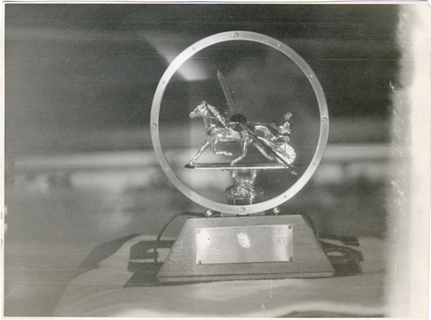View of the Wolverine Trophy at the Michigan Racing Association racetrack in Livonia, Michigan. Trophy depicts a harness driver and racehorse inside a circle. Handwritten on page: "Wolverine Trophy given to winner of 6th race. Wednesday, October 8th, 1952. M.R.A. (without flash)." Handwritten on back: "Wednesday, October 8th, 1952. Trophy given in 6th race at M.R.A. harness races won by (without flash)."