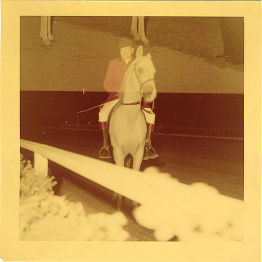Double exposure of steward James E. Stolte posing on horse "Nar" at the Michigan Racing Association racetrack in Livonia, Michigan. Handwritten on page: "Monday nite, October 6th, 1952. Detroit race track, harness races. Jim and Nar. (Double exposure)."