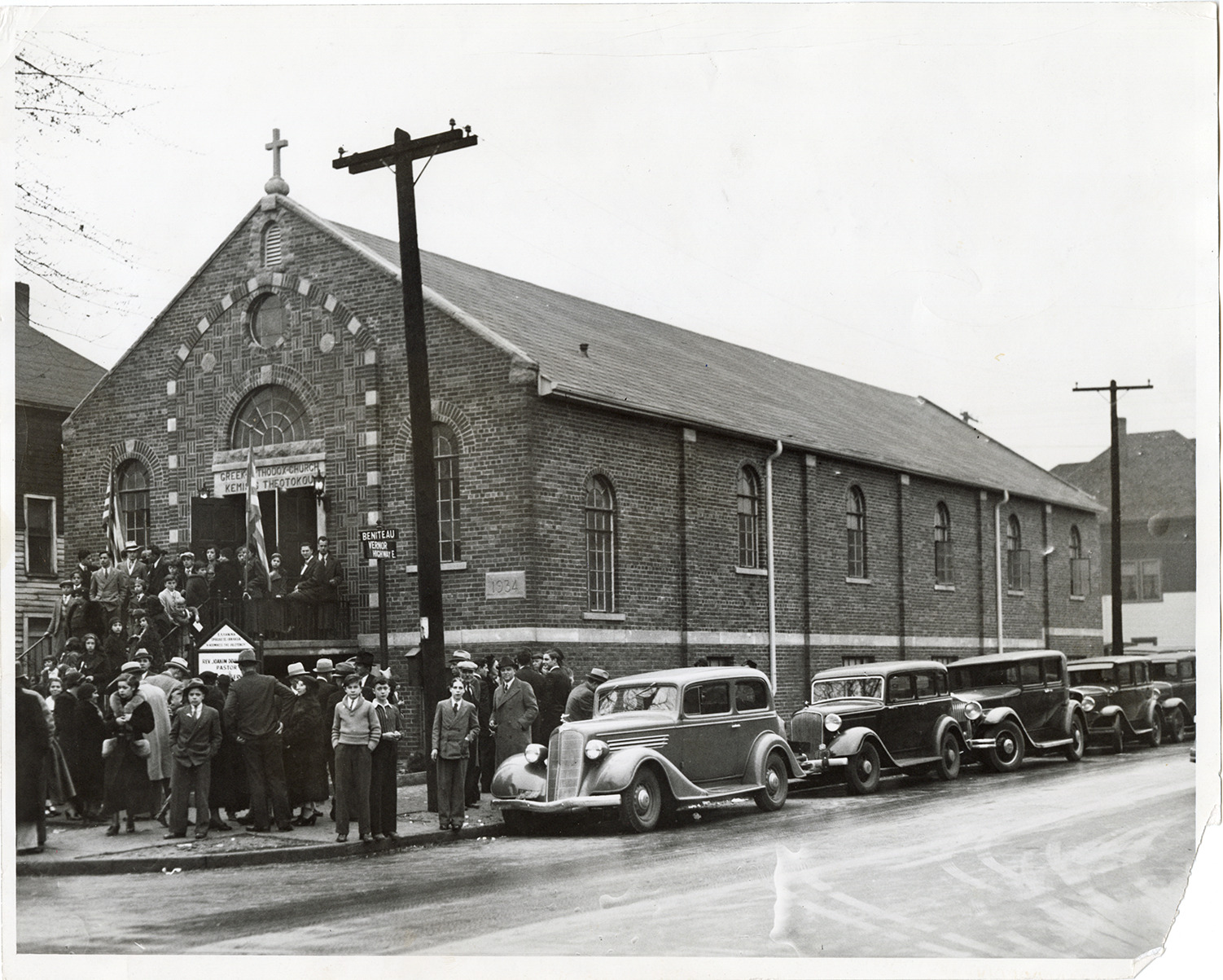 View of churchgoers gathered in front of building for the dedication of the East Side Greek Orthodox Church, located at the corner E. Vernor Highway and Beniteau. Stamped on back; "November 12, 1935." Handwritten on back: "Detroit churches, Greek. East Side Greek Orthodox Church dedicated 11/10/35. Koimesis Theotokov Greek Orthodox Church, Beniteau & E. Vernor."