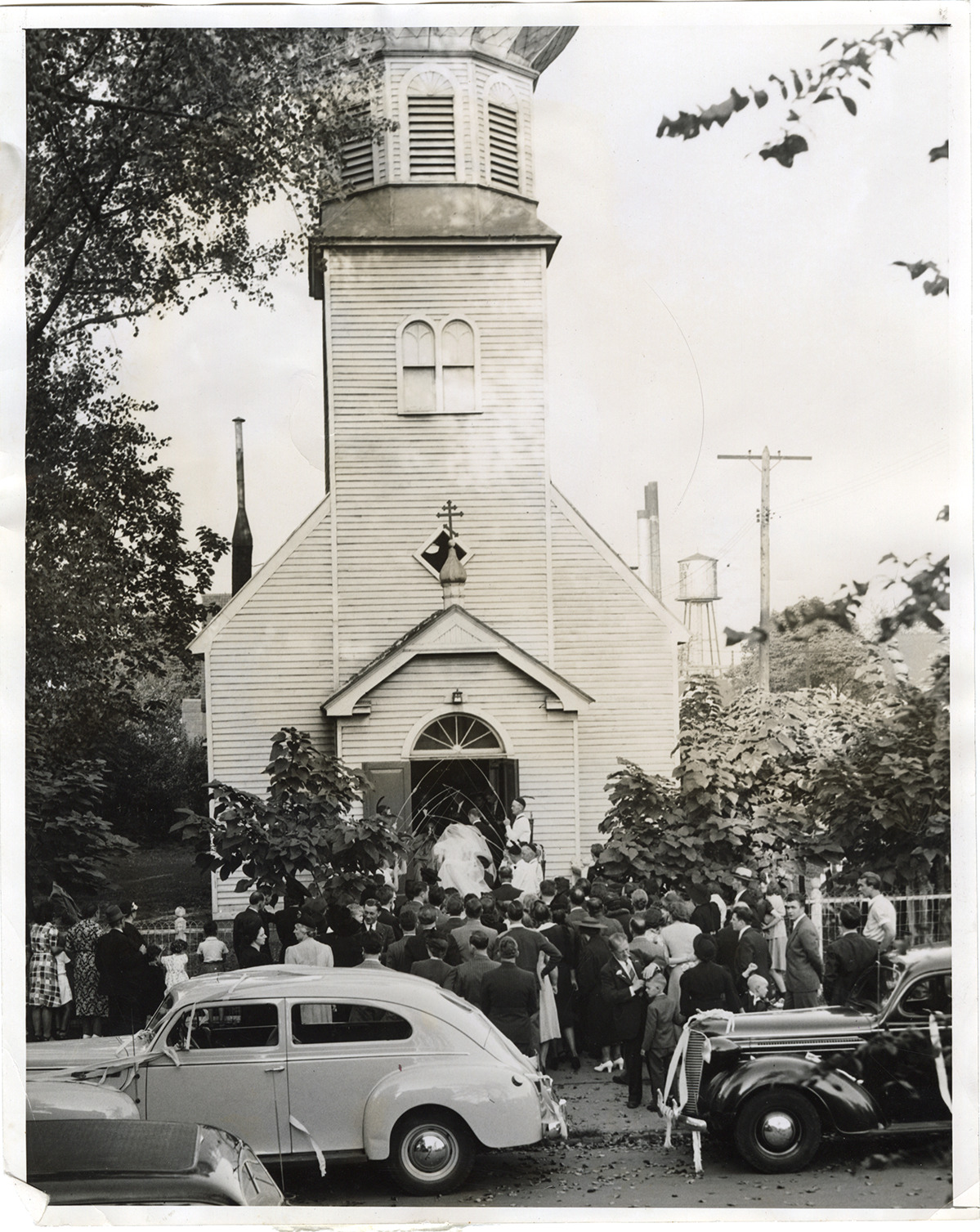 View of bride and groom entering SS. Peter and Paul Russian Greek Orthodox Church, located at Gilbert and Clayton. Crowd gathers on sidewalk in front of wooden-frame church building. Decorated cars in foreground. Label on back: "Photographer: [undecipherable]. Subject: Russian wedding. Names (L. to R.) The SS Peter & Paul Russian Greek Orthodox Catholic Church as bride enters." Stamped on back: "Sept 25, 1940." Handwritten on back: "Gilbert & Clayton. SS Peter and Paul Russian Greek Orthodox Church. Detroit churches, Greek Orthodox."