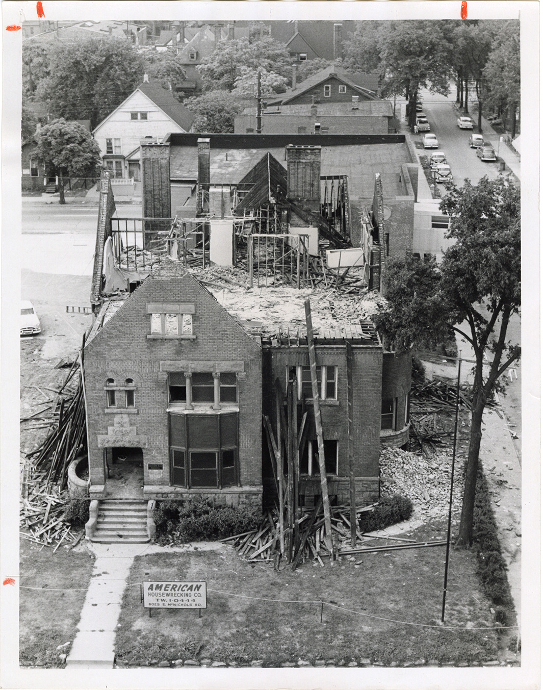 Bird's-eye view of the former Charles DuCharme house, located at 2165 E. Jefferson Avenue, being demolished. American Housewrecking Co. sign in front of house. Clipping on back: "Another Jefferson Ave. landmark is passing. This is the old Charles DuCharm [sic] home at 2165 E. Jefferson, showplace built in the 1880s. It was a true mansion in Detroit's golden era of mansions when E. Jefferson was one of the city's finest residential areas. it lived through the section's 'Bohemian' period when artists and writers starved in cluttered apartments in the fine old homes. Now it makes way for a quarter-million dollar extension of Alexander Blain Hospital, at right." Stamped on back: "Free Press photo, Jul 30, 1959."