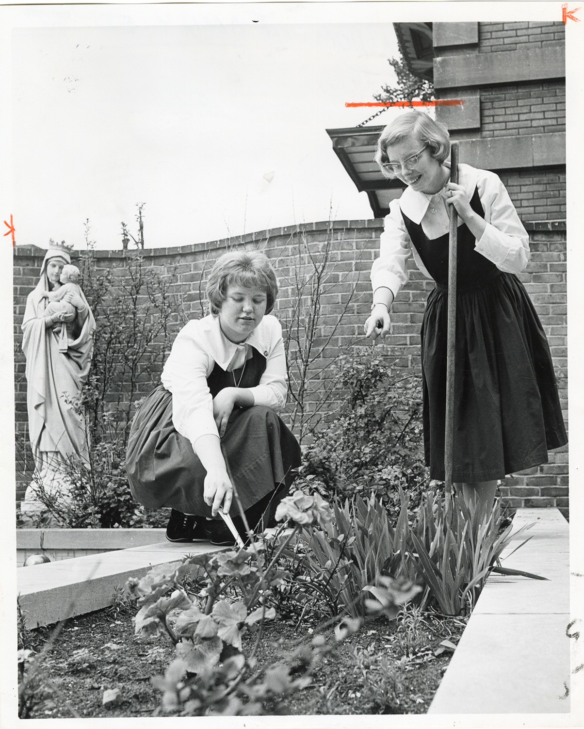 View of volunteers Patricia Woodley and Susan Rakoczy tending garden at Carmel Hall. Statue of Madonna and child at left; flowers in foreground. Brick wall in background. Clipping on back: "The garden in back of Carmel Hall is being kept in the pink for a tea and fashion show Wednesday. Patricia Woodley, left and Susan Rakoczy, of the Carmelets, have added manicuring the borders to their duties at the Hall. The Carmelets are high school girls who formed a volunteer group a year ago to help make the senior citizens living at Carmel more comfortable. Wednesday's party is for the benefit of the project." Label on back: "Detroit Free Press Photo Dept. Date: June 7. Photographer: Venaleck. Patricia Woodley, 16, St. Cla. Shores. Susan Rakoczy, 15, Det. Carmelets prepare garden for Carmel Hall tea."