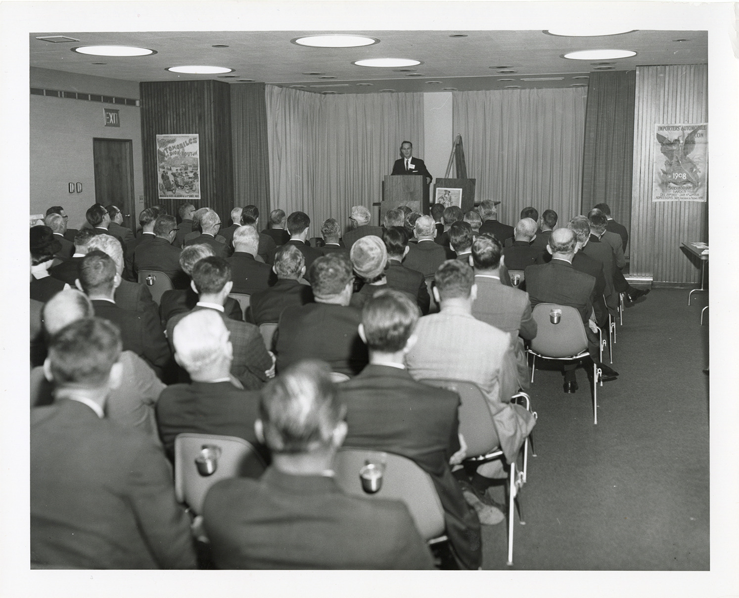 View of James J. Bradley, head of the National Automotive History Collection, delivering a lecture about the collection. Audience seated in rows in Explorers Room. Posters displayed on walls on both sides of stage. Handwritten on back: "James J. Bradley, head of the Automotive History Collection at podium."