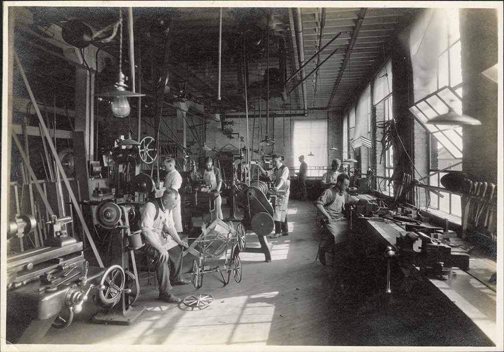 View of workers constructing Sturgis Luxury brand baby carriages at the Sturgis Steel Go-Cart Co. factory in Sturgis, Michigan. Label in album: "From the Parham Studio, photos, art goods & artistic picture framing, Sturgis, Mich."