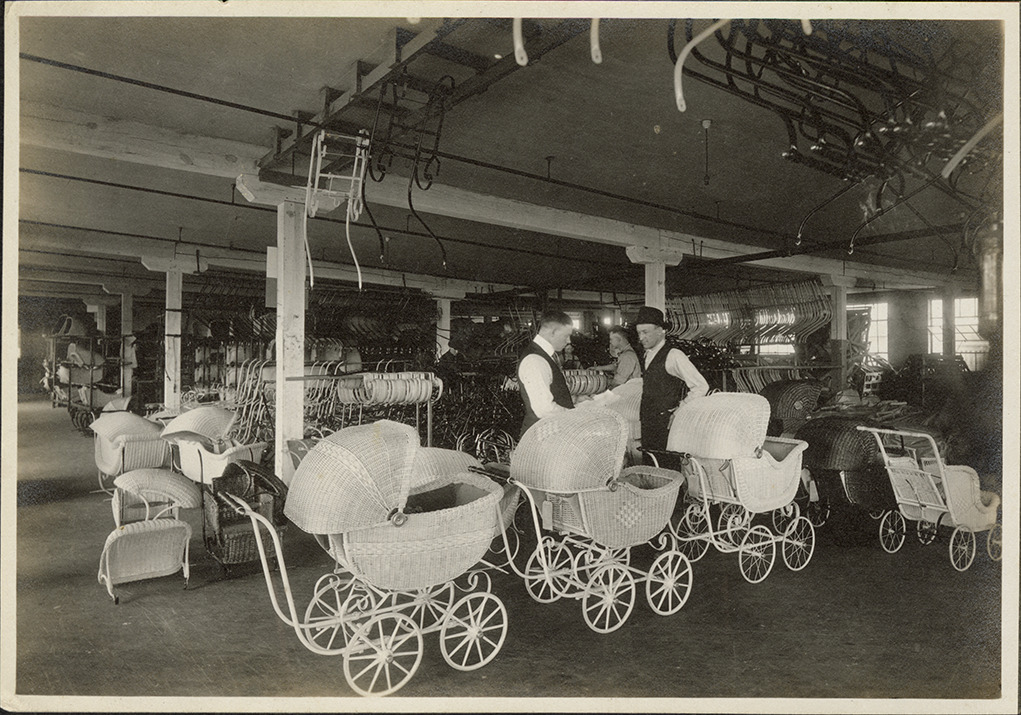 Part of an album of fourteen photographs documenting the manufacturing process of Sturgis Luxury baby carriages. "D.L. Seymour & Co., 1652 Penobscot Bldg, #13" is penciled inside front cover.