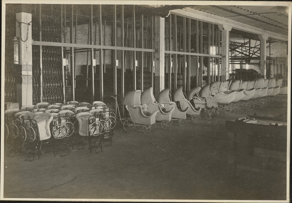 Part of an album of fourteen photographs documenting the manufacturing process of Sturgis Luxury baby carriages. "D.L. Seymour & Co., 1652 Penobscot Bldg, #13" is penciled inside front cover.
