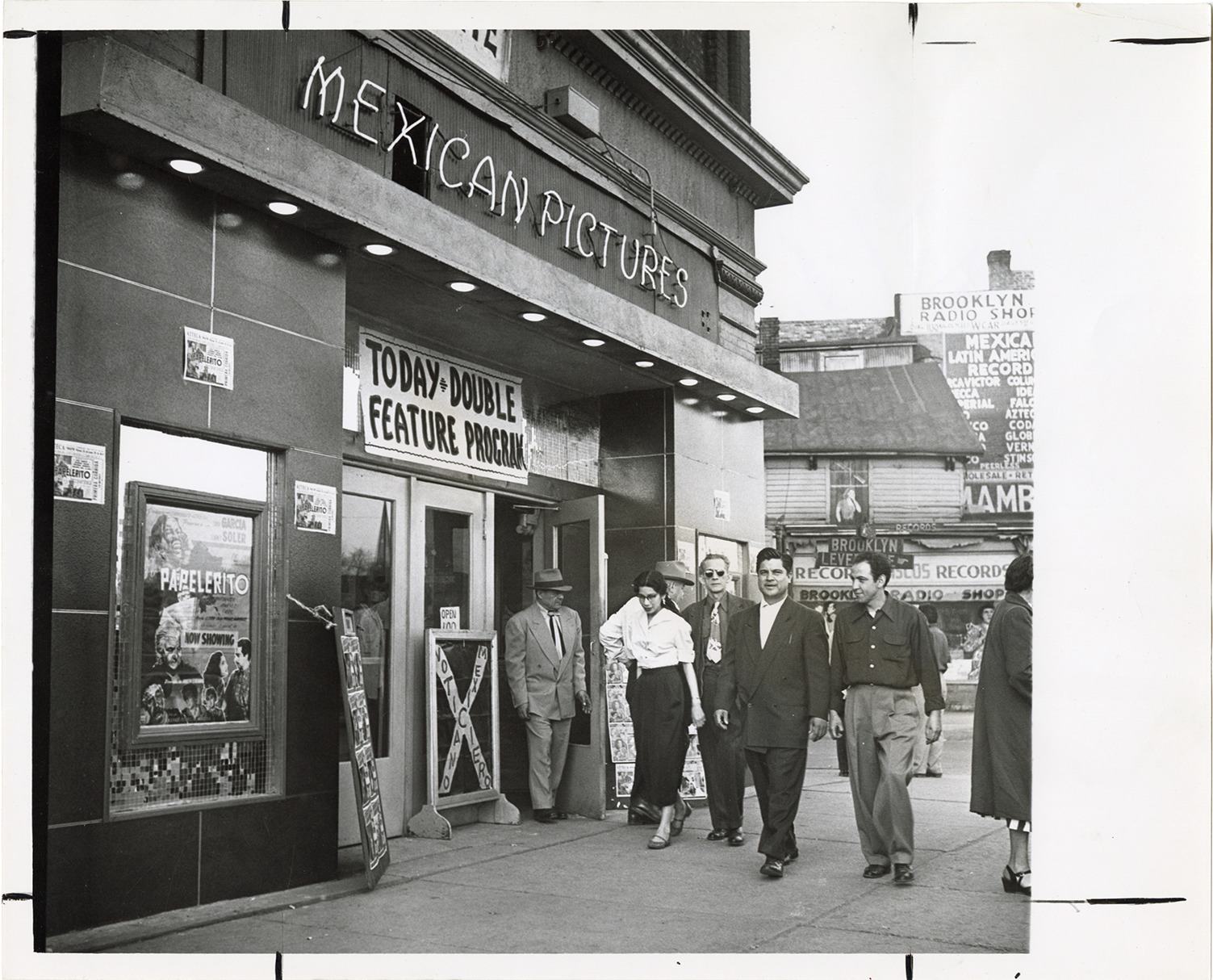 View of pedestrians walking in front of the Azteca Theater, located at Michigan Avenue and Brooklyn. Neon sign above entrance reads: "Mexican pictures." Sign directly over doorway reads: "Today, double feature program." Sign in window advertises the 1951 Mexican film, "Papelerito." Clipping affixed to back reads: "Two double feature are shown each week at the Azteca Theater, Michigan and Brooklyn. Spanish-language students are frequent patrons there. Sunday, May 18, 1952, Detroit Free Press, graphic." Handwritten on back: "Theaters, Mexican."