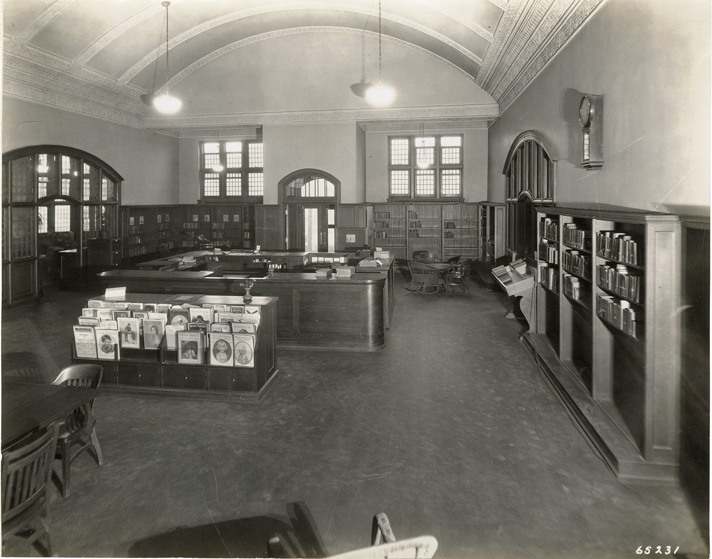 View of the Delivery Room of the Butzel Branch Library, Detroit Public Library. Room is furnished with reference desk, bookshelves, chairs, tables and magazine racks. Stamped on back: "Manning Bros., commercial photographers. 504-505 Lincoln Building. Corner State and Park Sts., Detroit, Mich." Typed on back: "Detroit Public Library, Butzel Branch, Delivery Room."