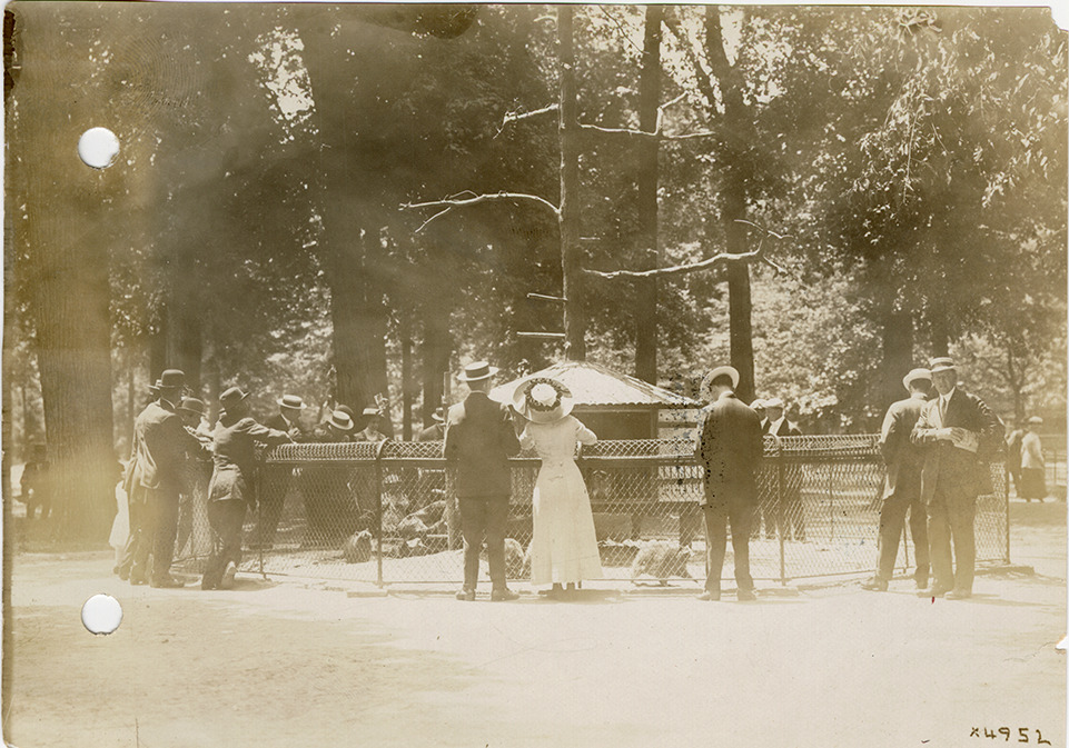 Favorite this☆ Visitors watching raccoons at Belle Isle Zoo Description: View of men and women watching raccoons in a fenced enclosure at the Belle Isle Zoo. Bare tree in zoo exhibit. Handwritten on back: "On Belle Isle." Details Resource ID: bh028288 Subject: Raccoon--Michigan--Detroit Zoos--Michigan--Detroit Belle Isle Park (Detroit, Mich.) Photographic prints Date Issued: 1912 Format: 1 photographic print ; 4.5 x 6.5 in. Member of: Burton Historical Collection Lazarnick Collection Filing Location: D/Parks-Belle Isle-Zoo Rights: Physical rights are retained by DPL. Copyright is retained in accordance with U.S. copyright laws.
