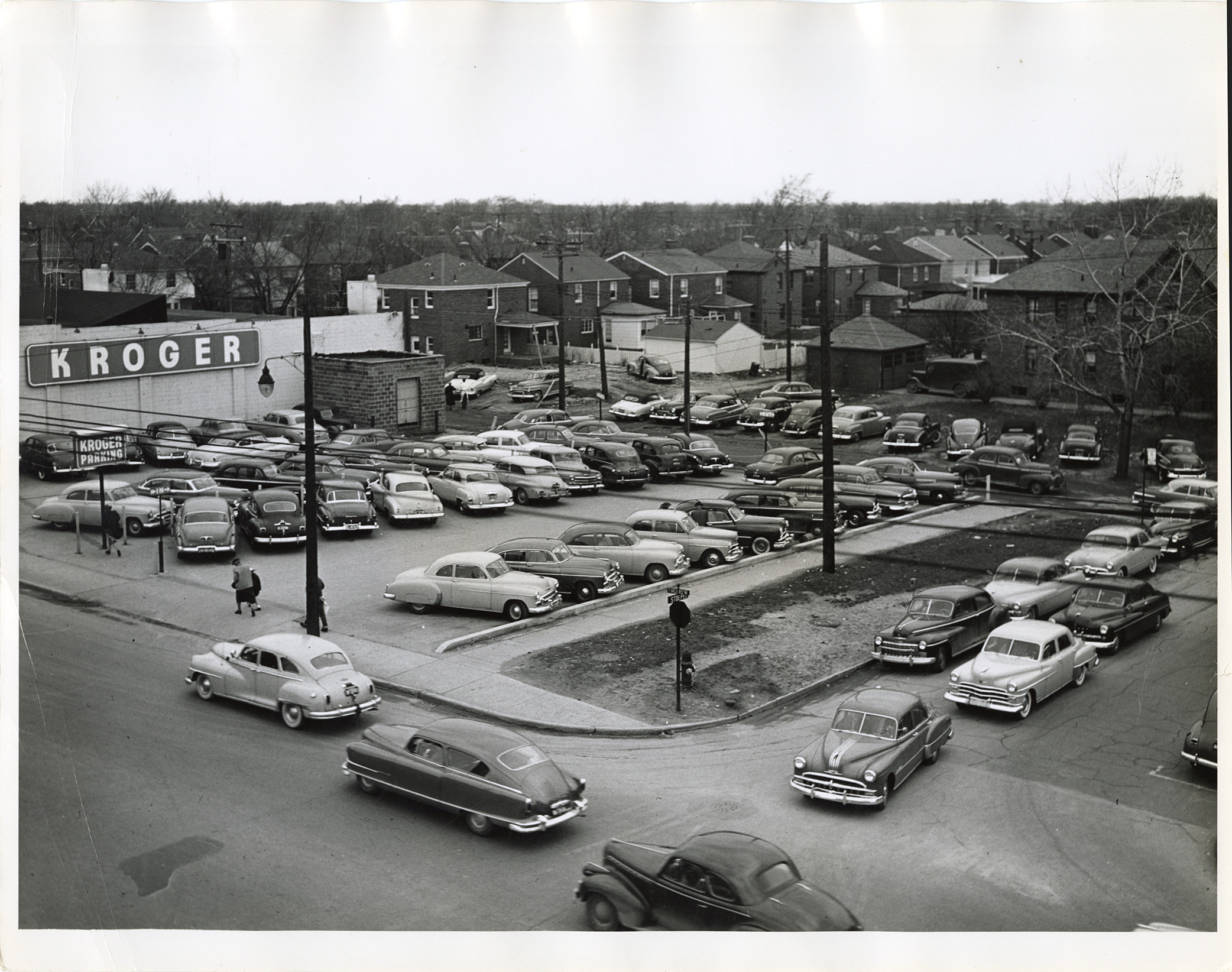 View of cars in Kroger grocery store parking lot at the corner of 7 Mile Rd. and Stoepel. Houses in background. Label on back: "Seven Mile-Livernois parking. Northwest corner of Stoepel and Seven Mile Road. View looking northwest from southeast corner. Saturday, April 14, 1951, 3:40 p.m." Stamped on back: "Detroit City Plan Commission. Photograph by Harold Raymond."