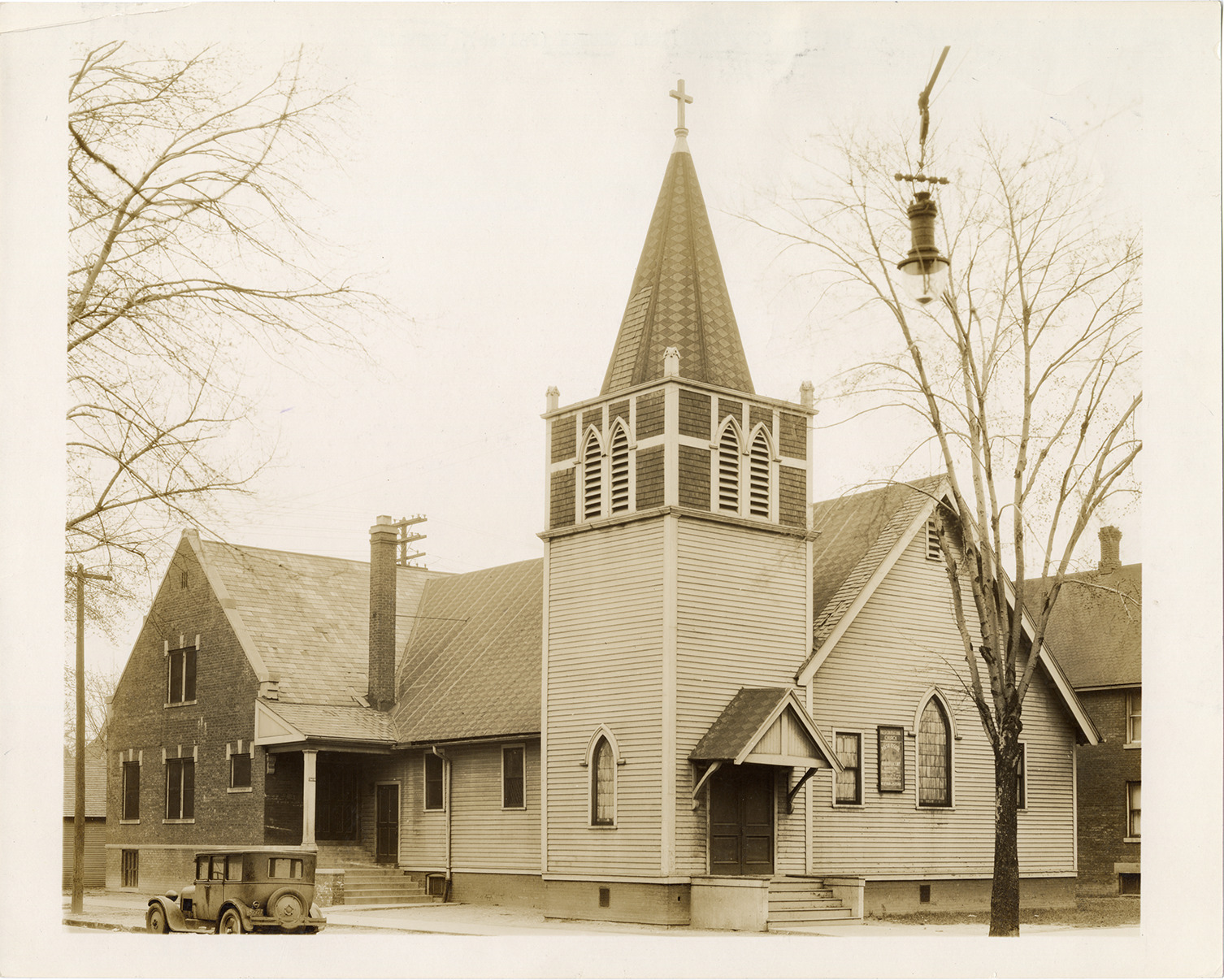 View of the Trinity Congregational church (Polish), located at the corner of East Hancock and Joseph Campau. Wooden-frame church has bell tower and stained glass windows. Automobile parked in street. Stamped on back: "J.W. Hughes, Detroit's photographer since 1885. Maccabee Bldg., Woodward at Putnam, phone Columbia 3249. Aug. 13, 1930. Free Press."