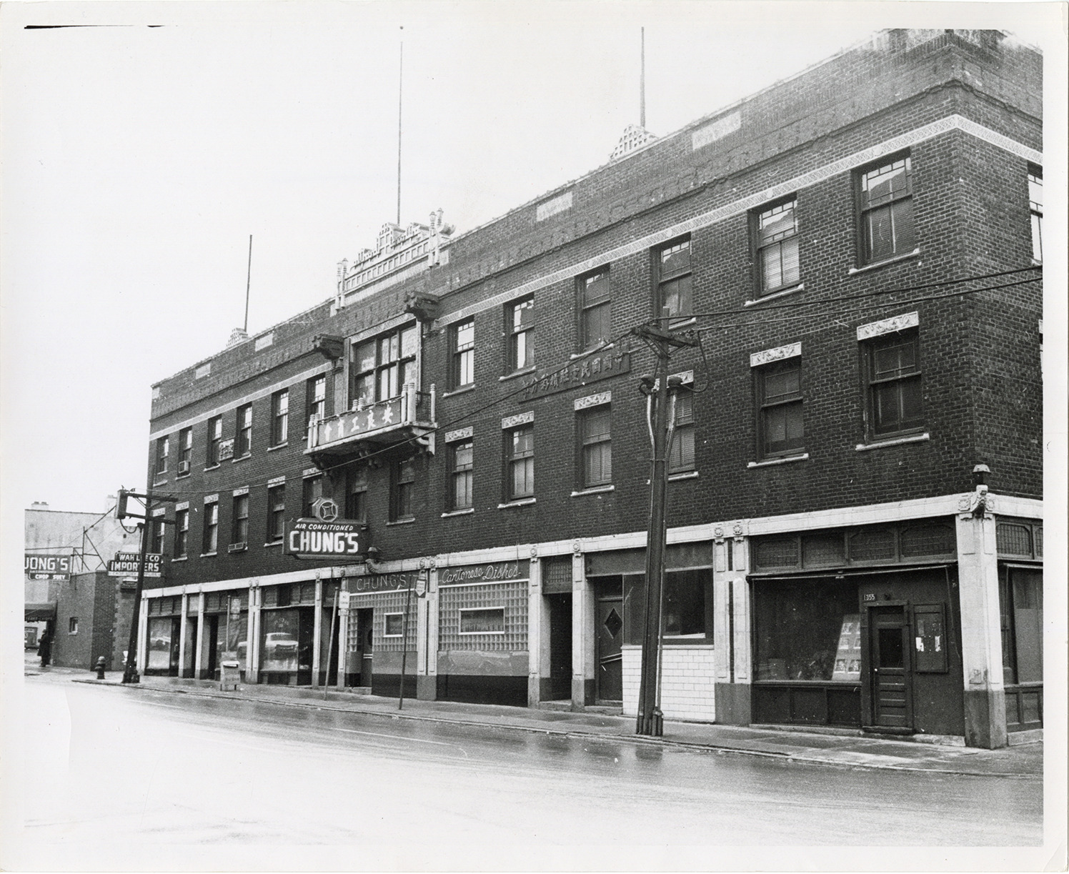View of several business located on 3rd St. in Chinatown. Chung's and Wong's restaurant signs on buildings. Sign on Chung's restaurant reads: "Air conditioned Chung's, Cantonese dishes." Wah Lee Co. importers in background. Stamped on back: "Detroit Free Press, Mar 13, 1962." Handwritten on back: "Detroit, Chinatown."