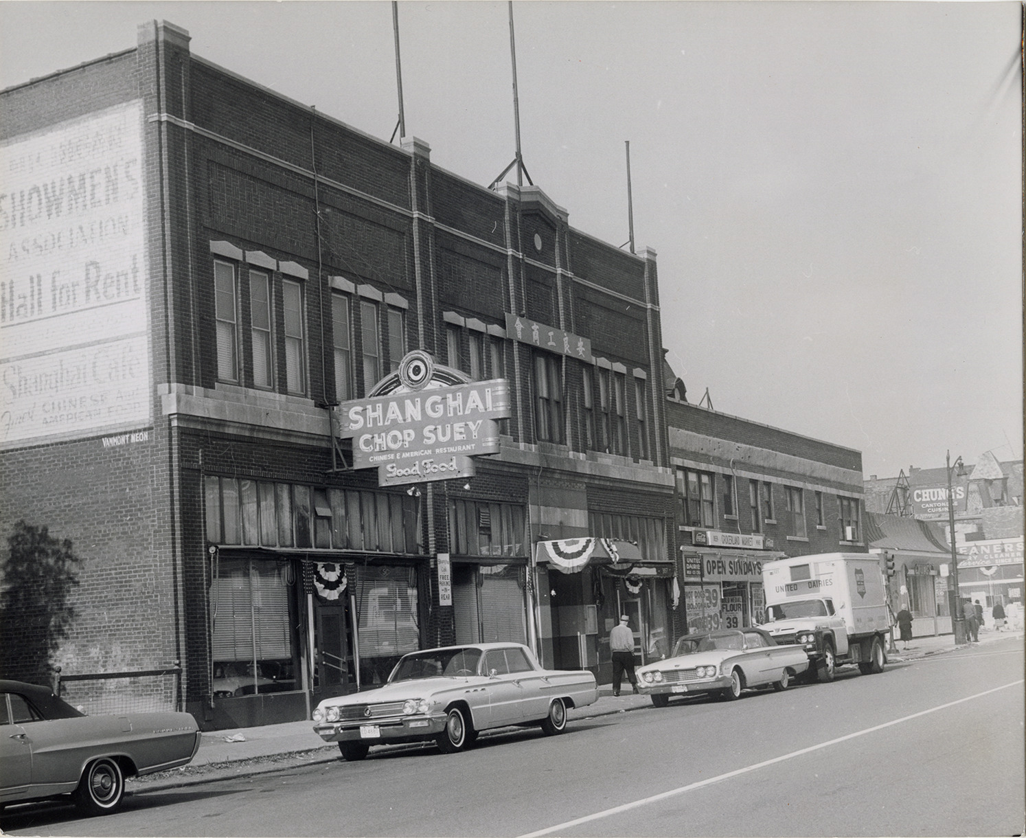 View of several business located on Cass Ave. in Chinatown. Neon sign reads: "Shanghai chop suey, Chinese & American restaurant, good food." Grocerland Market and Chung's Cantonese restaurant in background. Cars and a United Dairies truck parked in street. Stamped on back: "Detroit Free Press, Oct 14 1963." Handwritten on back: "Chinatown on Cass."