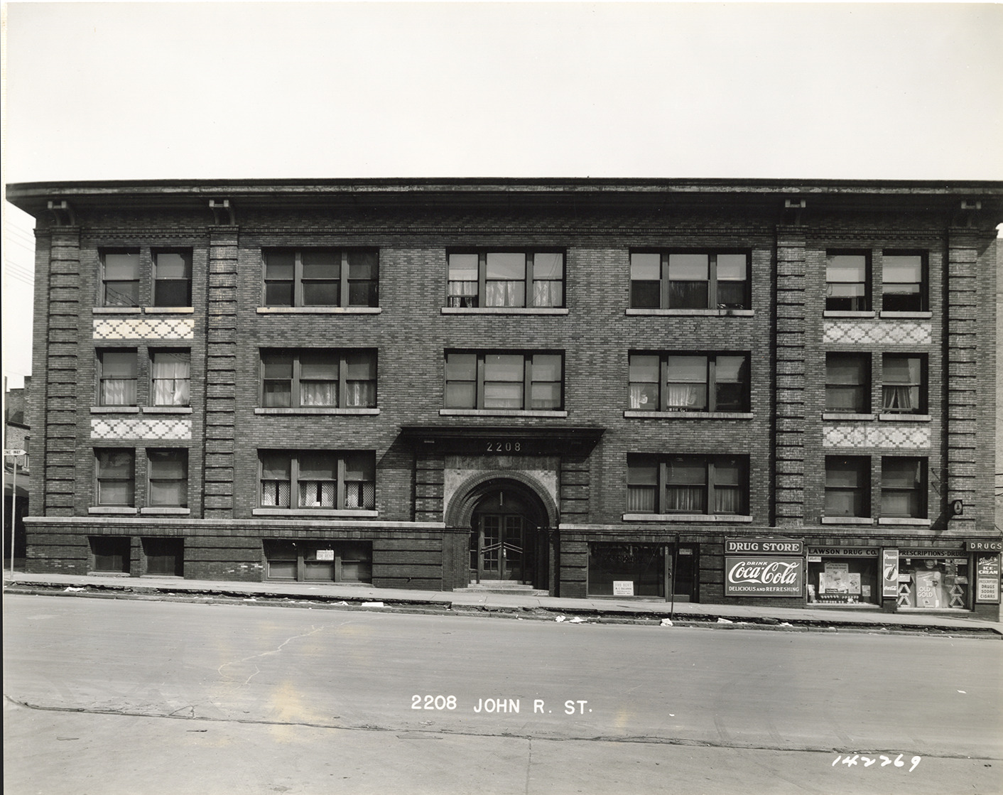 Favorite this☆ Apartment building at 2208 John R Street Description: View of a three-story brick apartment building located at 2208 John R St. Lawson Drug Co. is on ground level. Signs for Coca-Cola and Stroh's ice cream in front of store. Printed on front: "2208 John R. [sic] St." Details Resource ID: bh028319 Subject: Apartment houses--Michigan--Detroit Drugstores--Michigan--Detroit Streets--Michigan--Detroit Photographic prints Date Issued: Unknown year Format: 1 photographic print mounted on fabric ; 7.5 x 9.5 in. Member of: Burton Historical Collection Filing Location: D/Streets-John R Rights: Physical rights are retained by DPL. Copyright is retained in accordance with U.S. copyright laws.