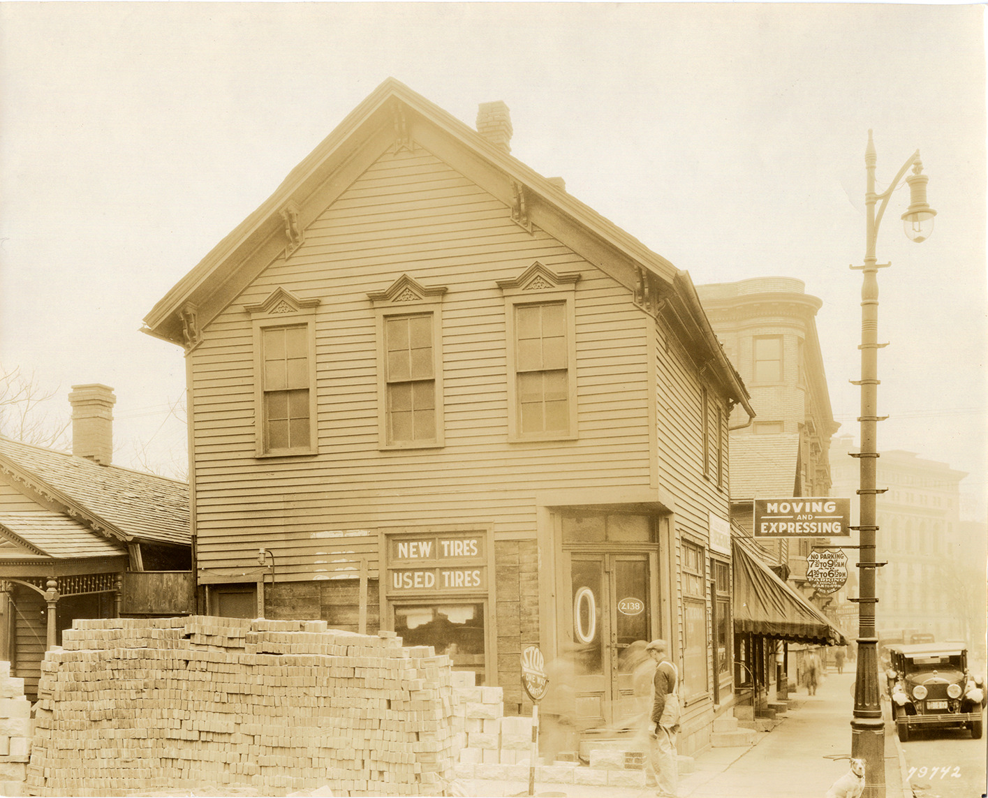 View of the John R Tire Repair Co. located at 2138 John R, at the corner of Columbia St. "New tires, used tires" painted in window; man wearing overalls stands on sidewalk. Dog sits in front of lamppost; pile of bricks in foreground. "Moving and expressing" sign on building in background. Stamped on back: "Manning Bros., commercial photographers. 504-505 Lincoln Building. Corner State and Park Sts., Detroit, Mich." Handwritten on back: "John R & Columbia."