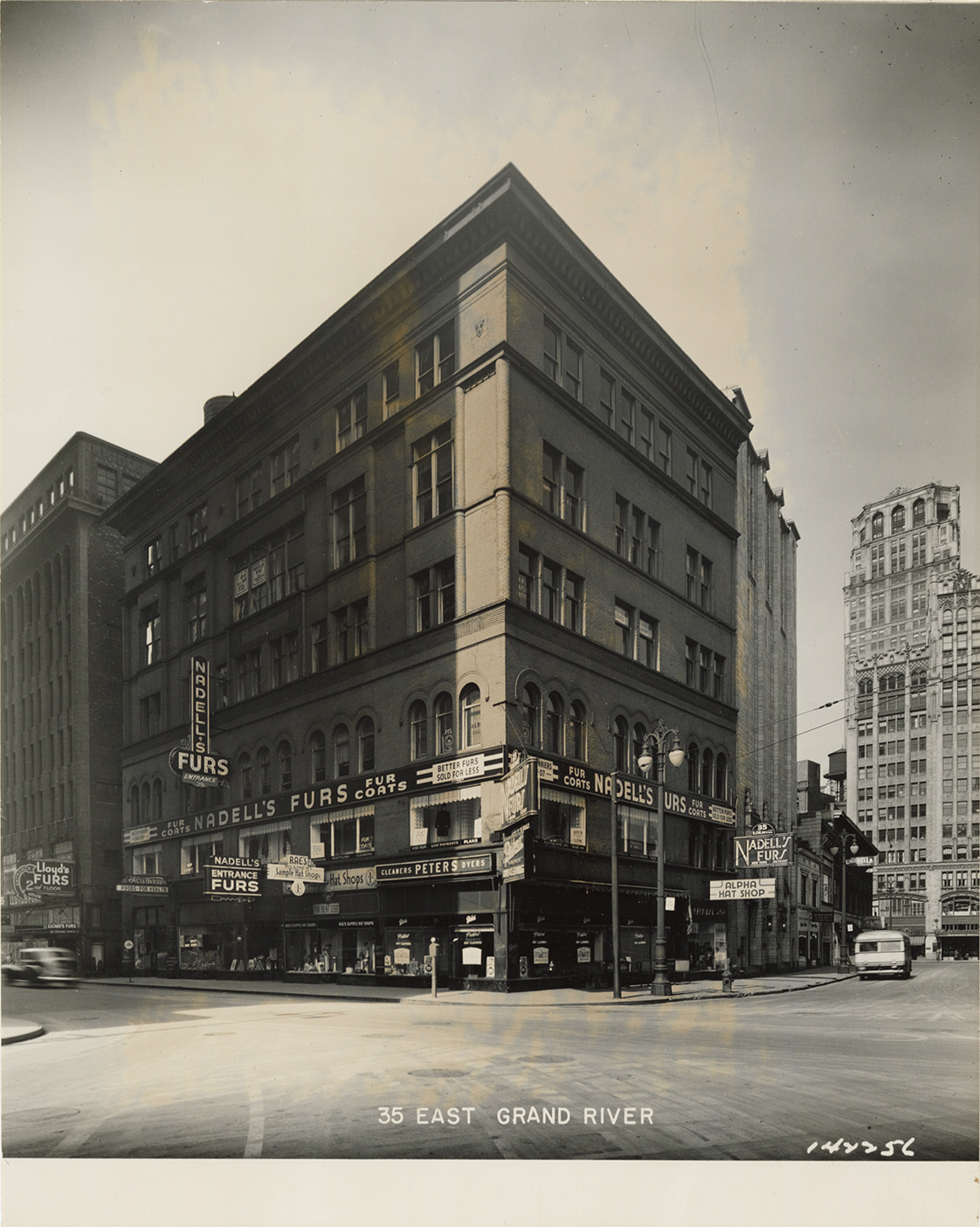 View of Nadell's Furs located at 35 E. Grand River Ave. Signs for Alpha Hat Shop, Peters cleaners and Rae's Millinery on building. Printed on front: "35 East Grand River."
